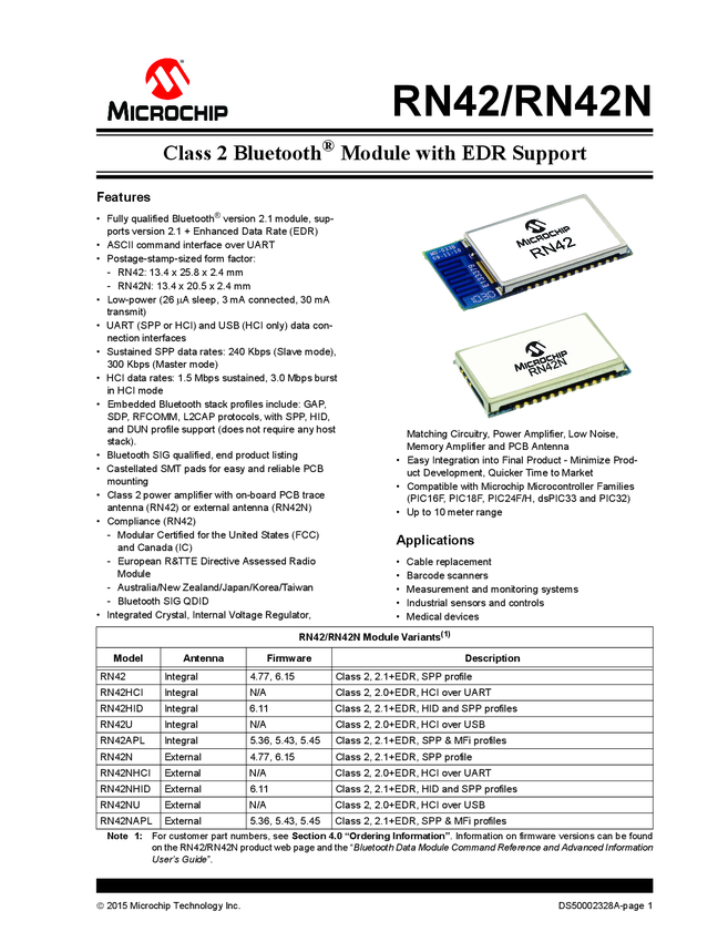 RN42/RN42N Class 2 Bluetooth Module with EDR Support Data Sheet