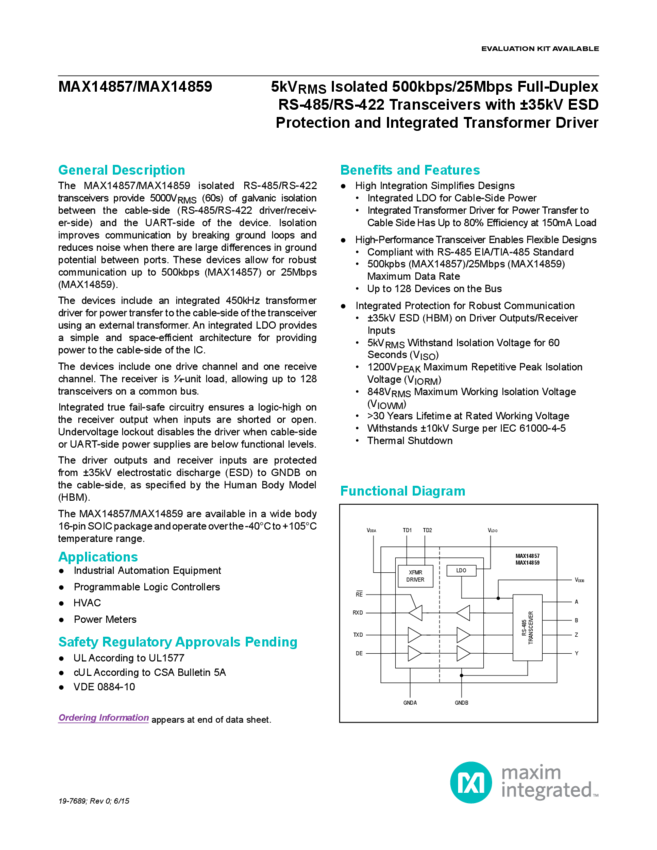 MAX14859 5kVRMS Isolated 25Mbps Full-Duplex RS-485/RS-422 Transceiver with ESD Protection and Transformer Driver