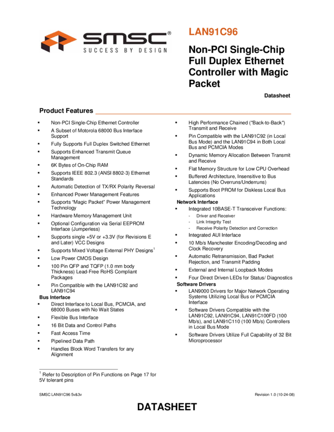 LAN91C96 Non-PCI Single-Chip Full Duplex Ethernet Controller with Magic Packet