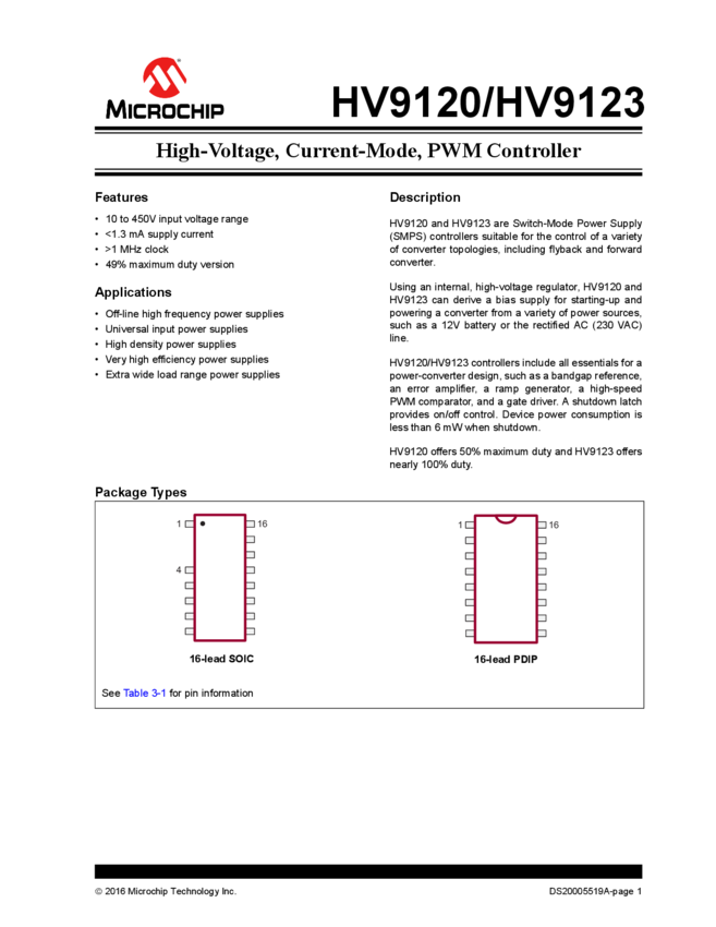 HV9120/HV9123 Datasheet - High-Voltage, Current-Mode, PWM Controller