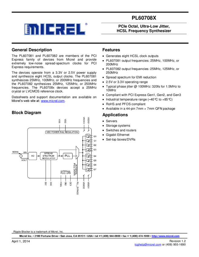 PL607081 PL60708X - PCIe Octal, Ultra-Low Jitter, HCSL Freq Synth