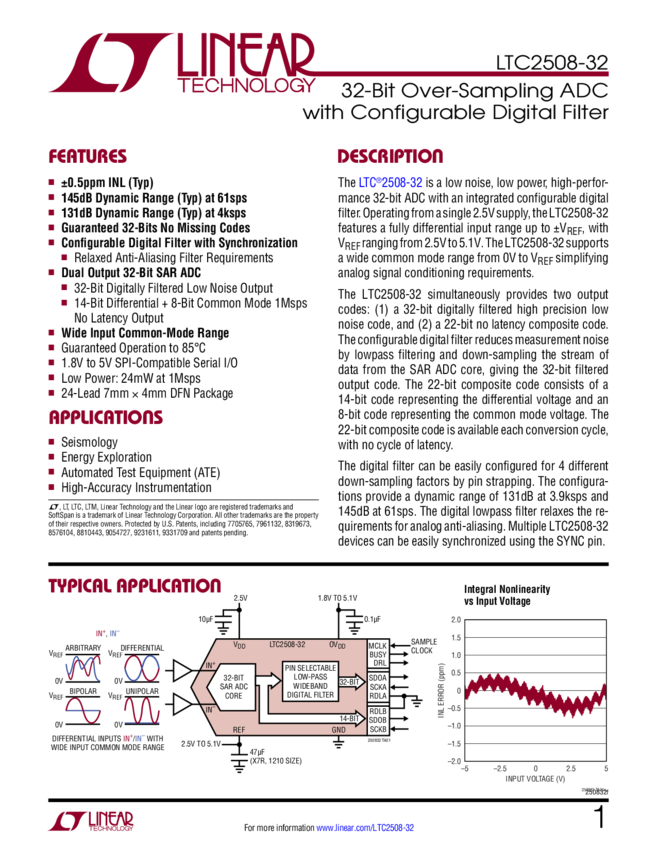 LTC2508-32 32-Bit Over-Sampling ADC with Configurable Digital Filter