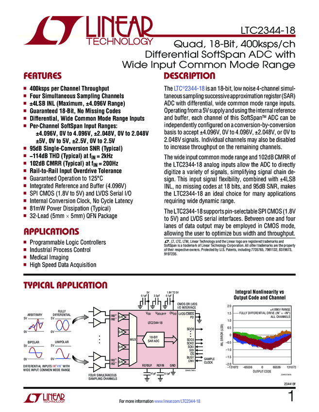 LTC2344-18 Quad, 18-Bit, 400ksps/ch Differential SoftSpan ADC with Wide Input Common M...
