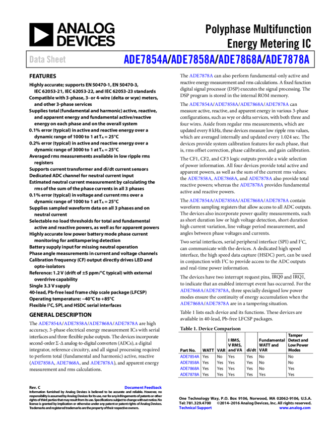 ADE7854A Polyphase Multifunction Energy Metering IC