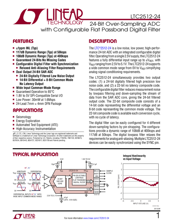 LTC2512-24 24-Bit Over-Sampling ADC with Configurable Flat Passband Digital Filter