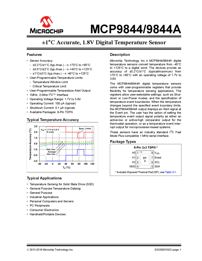 MCP9844 MCP9844/9844A ±1°C Accurate, 1.8V Digital Temperature Sensor