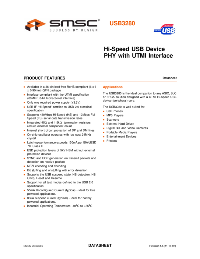 USB3280 High-Speed USB Device PHY with UTMI Interface Data Sheet