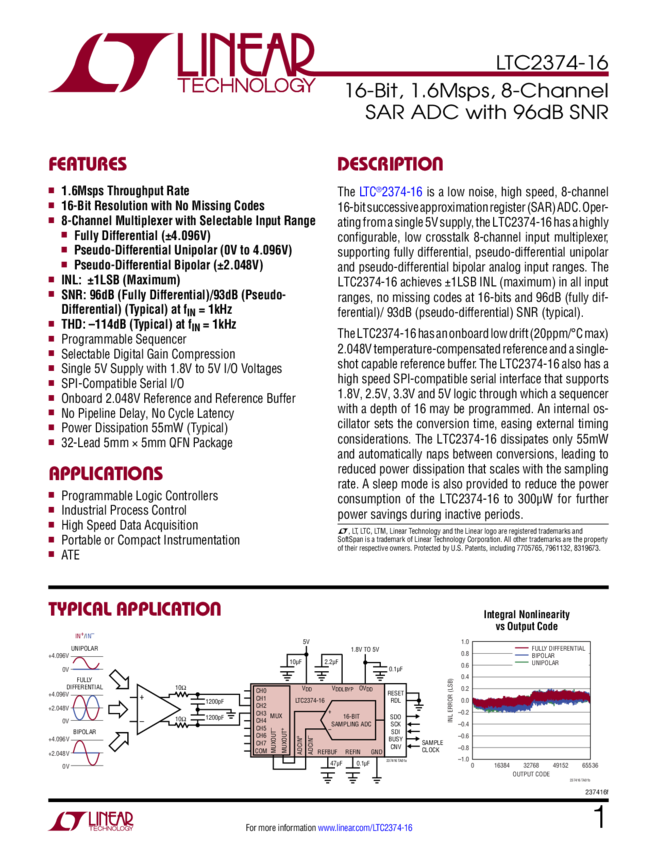 LTC2374-16 16-Bit, 1.6Msps, 8-Channel SAR ADC with 96dB SNR