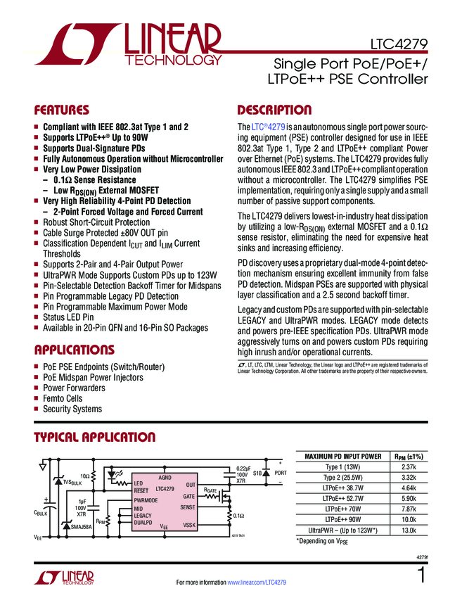 LTC4279 Single Port PoE/PoE+/ LTPoE++ PSE Controller
