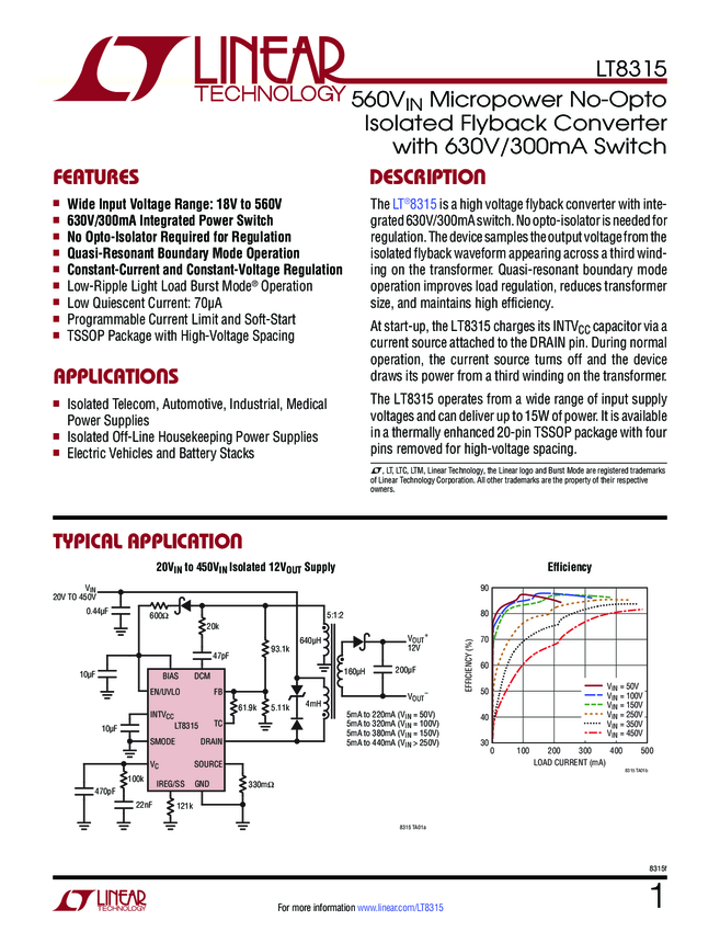 LT8315 560VIN Micropower No-Opto Isolated Flyback Converter with 630V/300mA Switch