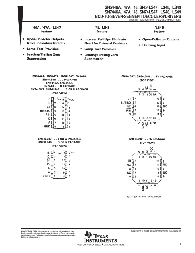 7446, 74LS46, 7447, 7448, 74LS48, 7449, 74LS49, SN7446A, SN7447A, SN7448, SN74LS46, SN74LS47, SN74LS48