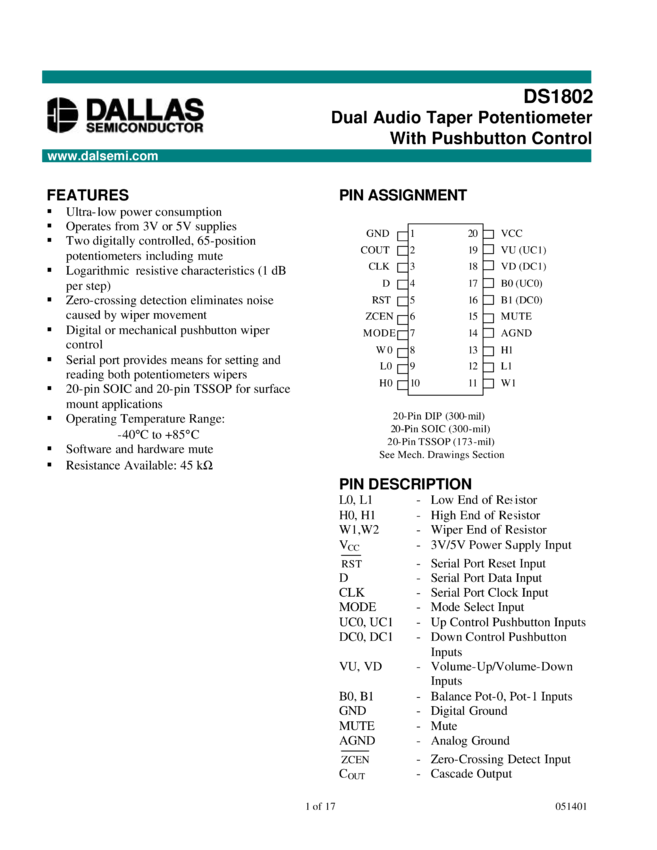 DS1802 Dual Audio Taper Potentiometer with Pushbutton Control