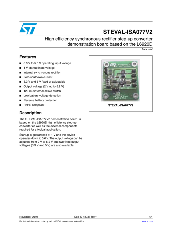 STEVAL-ISA077V2 High efficiency synchronous rectifier step-up converter demonstration board...