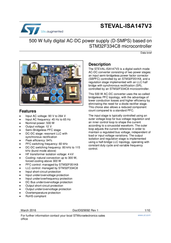 STEVAL-ISA147V3 500 W fully digital AC-DC power supply (D-SMPS) based on STM32F334C8 microc...