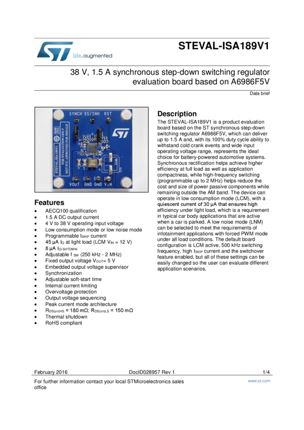 STEVAL-ISA189V1 38 V, 1.5 A synchronous step-down switching regulator evaluation board base...