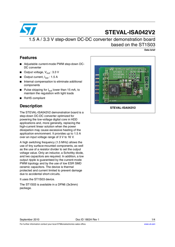 1.5 A / 3.3 V step-down DC-DC converter demonstration board based on the ST1S03