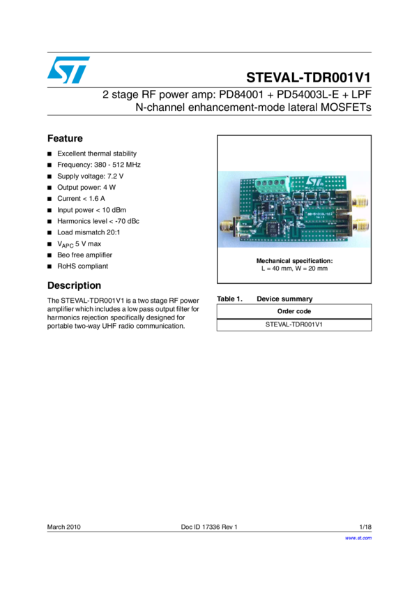 STEVAL-TDR001V1 4 W / 380 - 512 MHz reference design using PD84001 + PD54003L-E + LPF