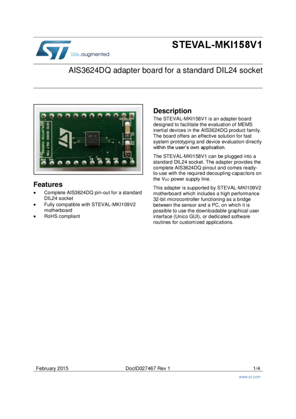 STEVAL-MKI158V1 AIS3624DQ adapter board for a standard DIL24 socket