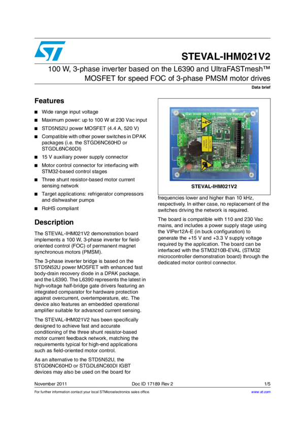 STEVAL-IHM021V2 100 W, 3-phase inverter based on L6390 and UltraFASTmesh™ MOSFET for speed...