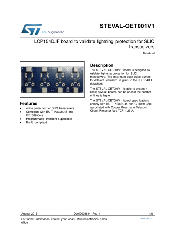 STEVAL-OET001V1 LCP154DJF board to validate lightning protection for SLIC transceivers