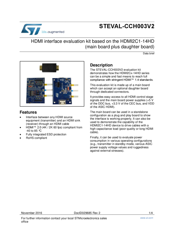 STEVAL-CCH003V2 HDMI interface demonstration kit based on the HDMI2C1-14HD (main board plus...