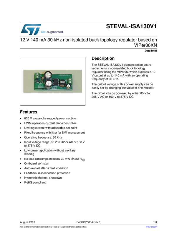 STEVAL-ISA130V1 12 V 140 mA 30 kHz non-isolated buck topology regulator based on VIPer06XN