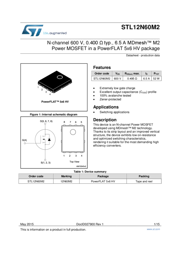 STL12N60M2 N-channel 600 V, 0.400 Ohm typ., 6.5 A MDmesh M2 Power MOSFET in PowerFLAT...