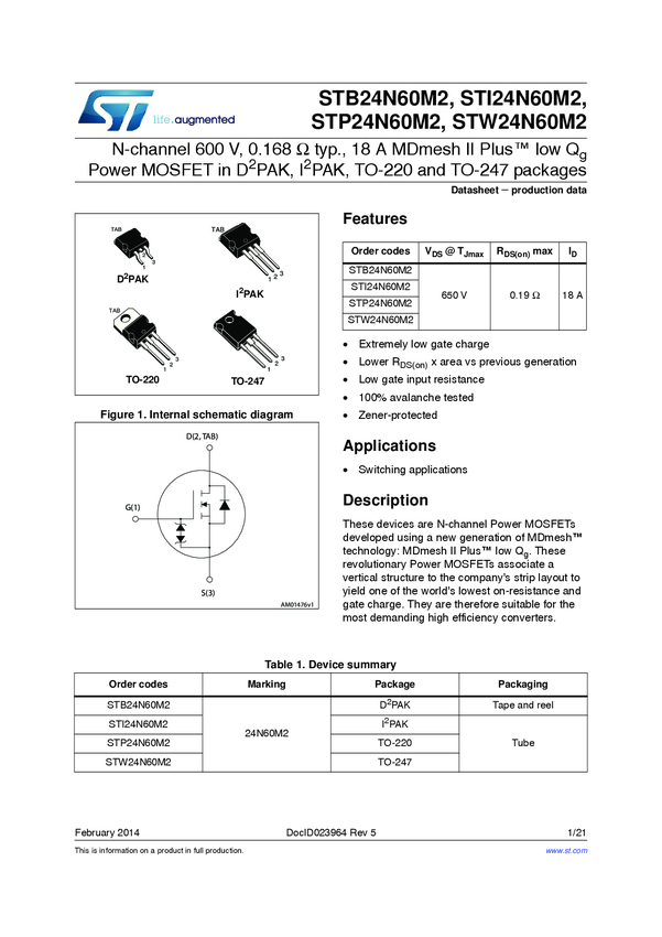 STB24N60M2 N-channel 600 V, 0.168 Ohm typ., 18 A MDmesh M2 Power MOSFET in D2PAK packa...