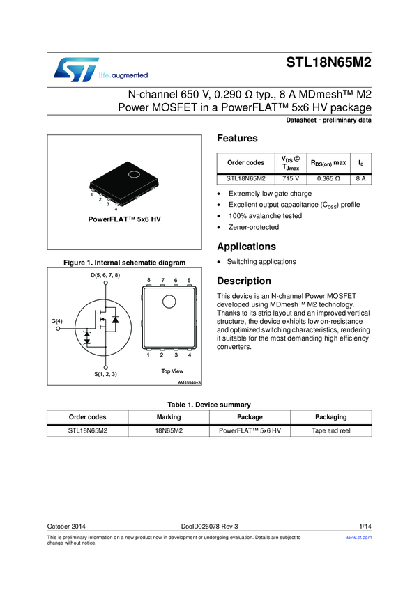 STL18N65M2 N-channel 650 V, 0.29 Ohm typ., 8 A MDmesh M2 Power MOSFET in a PowerFLAT 5...
