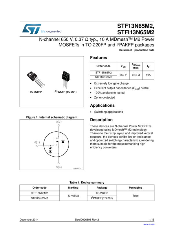 STF13N65M2 N-channel 650 V, 0.37 Ohm typ., 10 A MDmesh M2 Power MOSFET in TO-220FP pac...