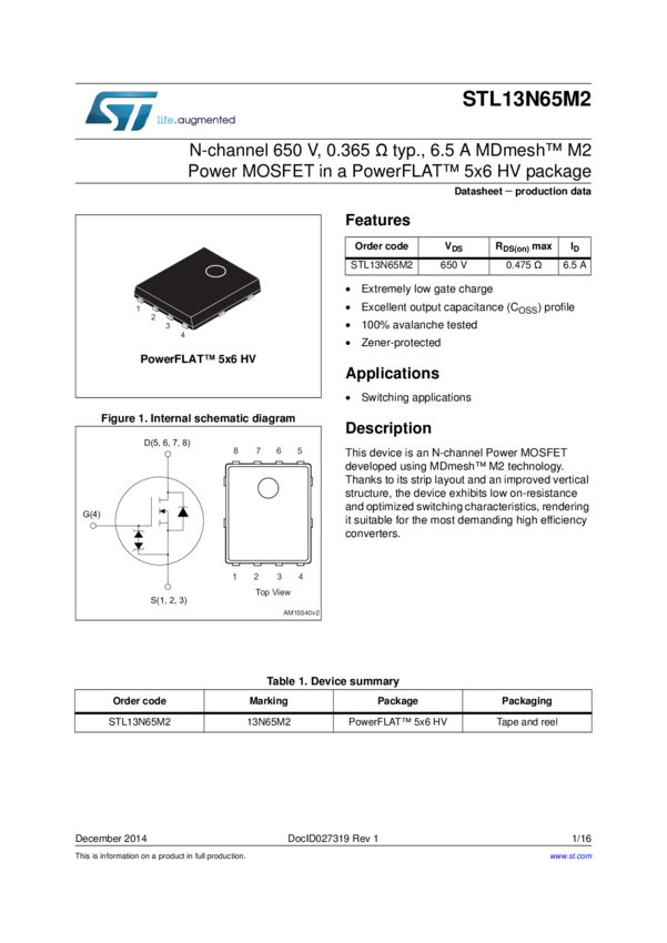 STL13N65M2 N-channel 650 V, 0.365 Ohm typ., 6.5 A MDmesh M2 Power MOSFET in a PowerFLA...
