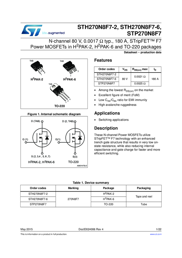 STP270N8F7 N-channel 80 V, 2.1 mOhm typ., 180 A STripFET F7 Power MOSFET in TO-220 pac...