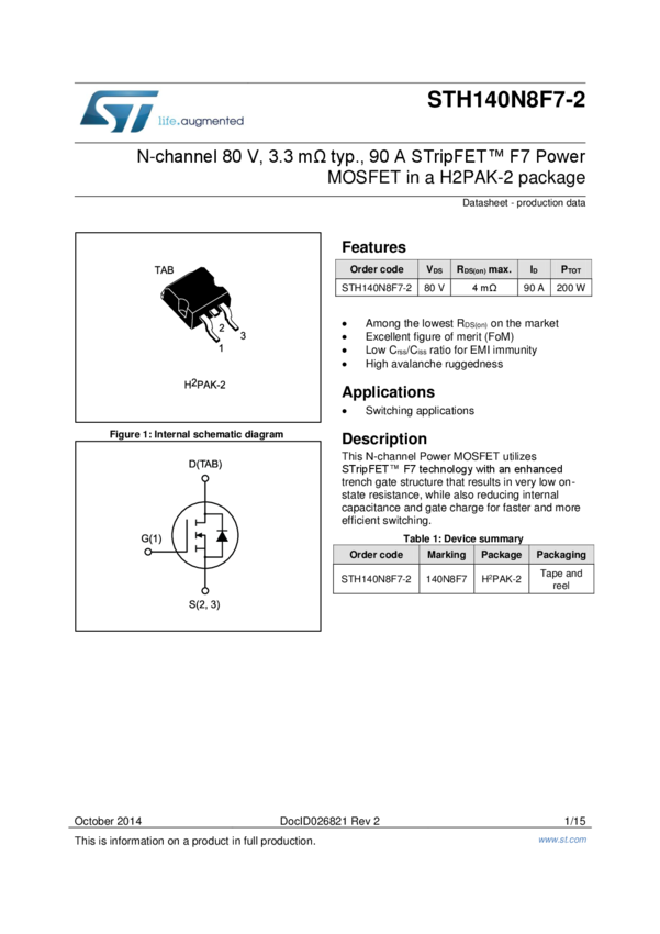 STH140N8F7-2 N-channel 80 V, 3.3 mOhm typ., 90 A STripFET F7 Power MOSFET in H2PAK-2 pac...