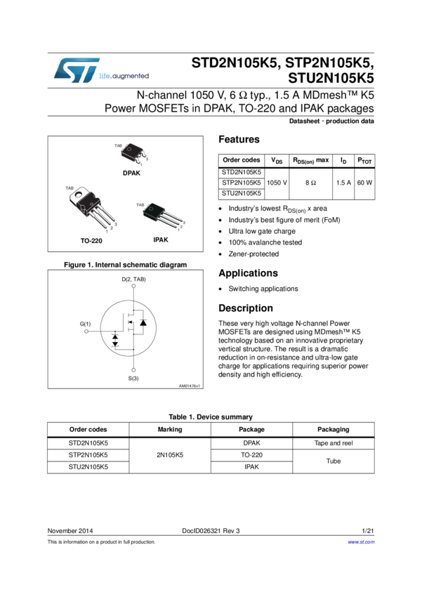 STD2N105K5 N-channel 1050 V, 6 Ohm typ., 1.5 A MDmesh K5 Power MOSFET in DPAK package