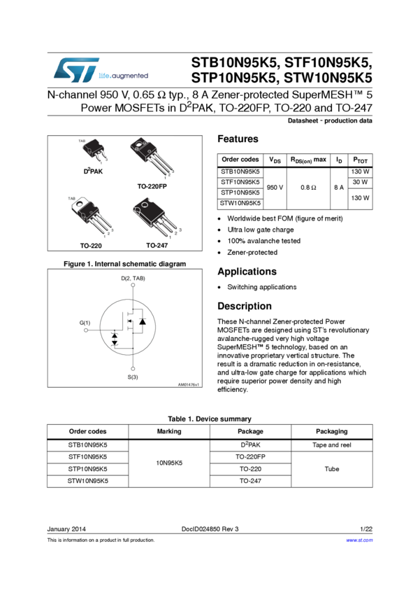 STB10N95K5 N-channel 950 V, 0.65 Ohm typ., 8 A Zener-protected SuperMESH(TM) 5 Power M...