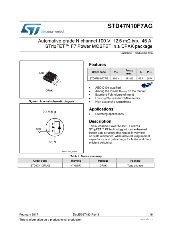 STD47N10F7AG Automotive-grade N-channel 100 V, 0.0125 Ohm typ., 45 A STripFET F7 Power M...