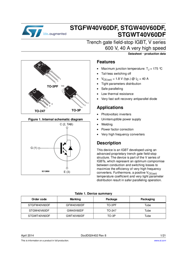 STGW40V60DF Trench gate field-stop IGBT, V series 600 V, 40 A very high speed