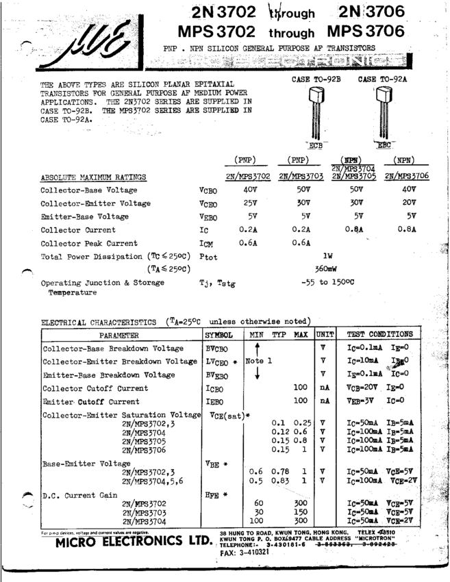 2N3402, 2N3403, 2N3404, 2N3405, 2N3703, 2N3704, 2N3705, 2N3706, 2N4425, 2N5220, 2N5221, 2N5226, 2N5354, 2N5355, 2N5356, 2N5418, 2N5419, 2N5451, MPS3702, MPS3705, MPS3706