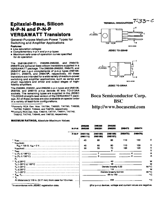 2N6106, 2N6107, 2N6108, 2N6109, 2N6110, 2N6111, 2N6288, 2N6289, 2N6291, 2N6292, 2N6293, 2N6473, 2N6474, 2N6475