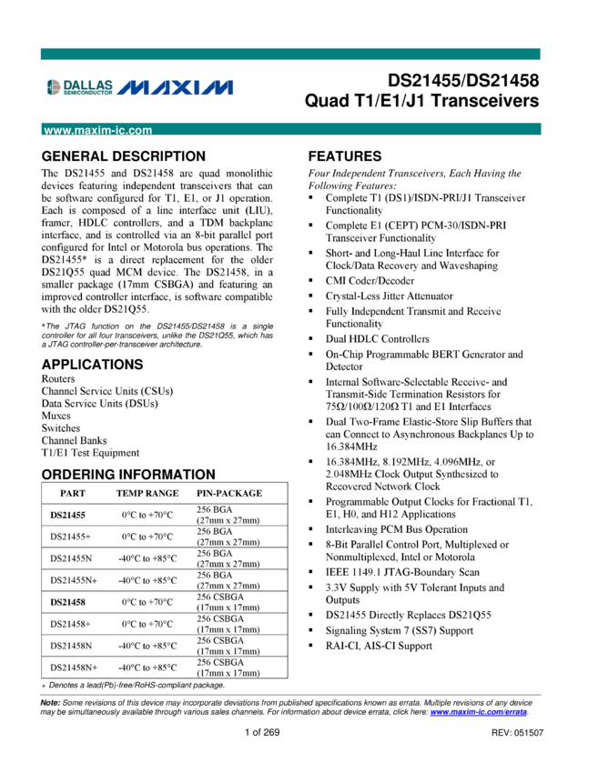 DS21455 DS21455, DS21458 Quad T1/E1/J1 Transceivers
