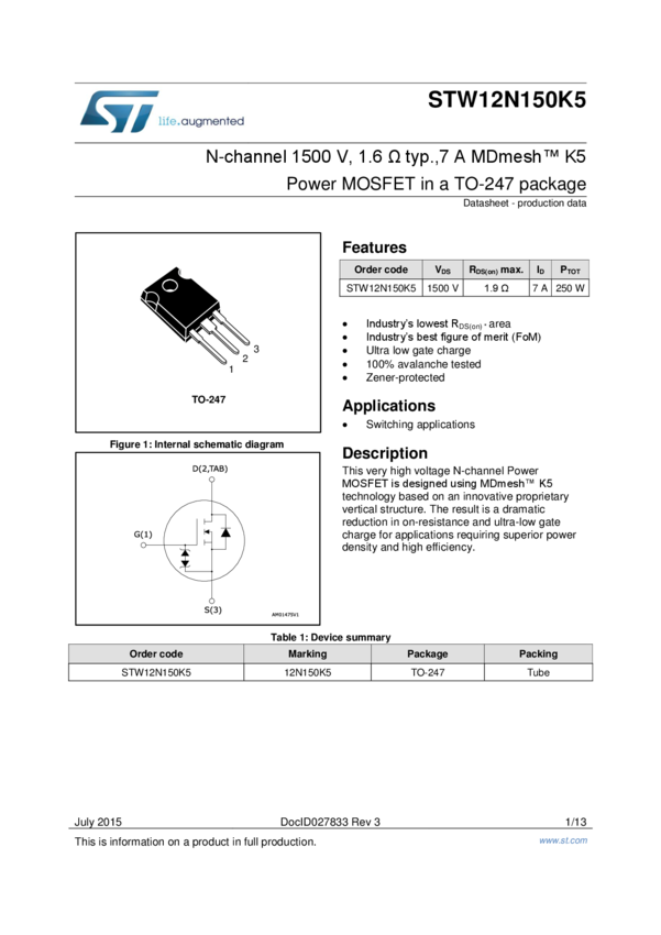 STW12N150K5 N-channel 1500 V, 1.6 Ohm typ., 7 A MDmesh K5 Power MOSFET in a TO-247 pack...