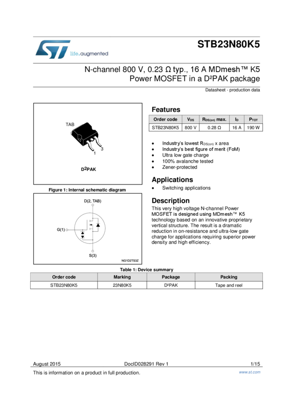 STB23N80K5 N-channel 800 V, 0.23 Ohm typ., 16 A MDmesh K5 Power MOSFET in D2PAK packag...