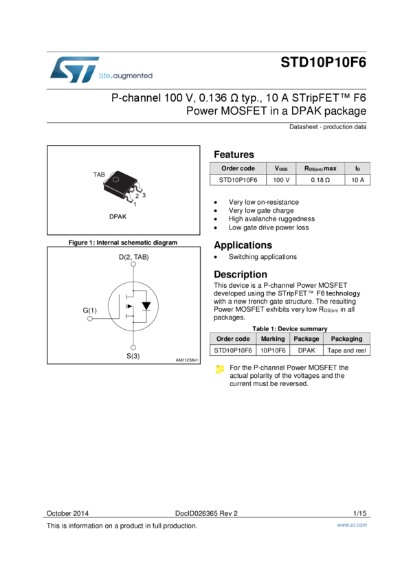 STD10P10F6 P-channel 100 V, 0.136 Ohm typ., 10 A STripFET F6 Power MOSFET in a DPAK pa...