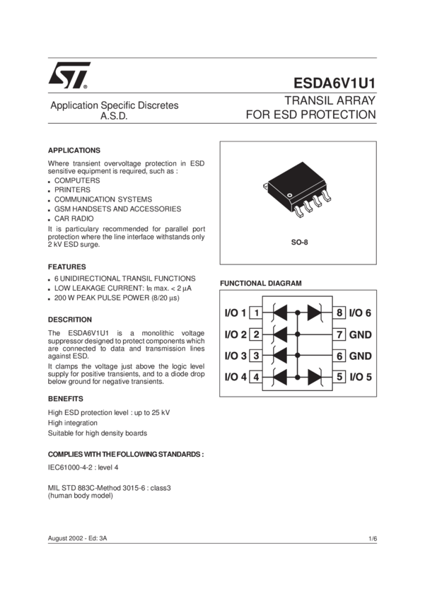 ESDA6V1U1 TRANSIL ARRAY FOR ESD PROTECTION