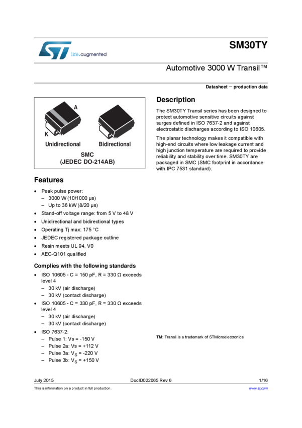 SM30TY Automotive 3000 W TVS in SMC package
