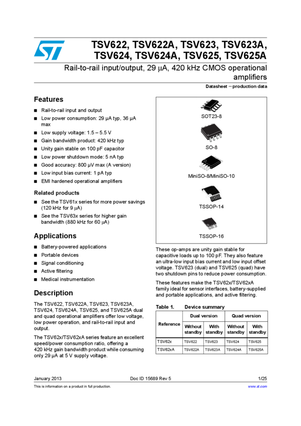 TSV624 Rail-to-rail input/output 5V CMOS Op-Amps, micro-power (29uA), GBP=420kHz,...