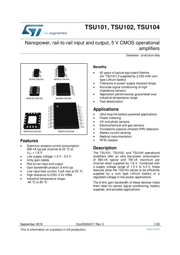 TSU104 Nanopower (580nA) 5V CMOS Op-Amp, rail-to-rail input/output, quad