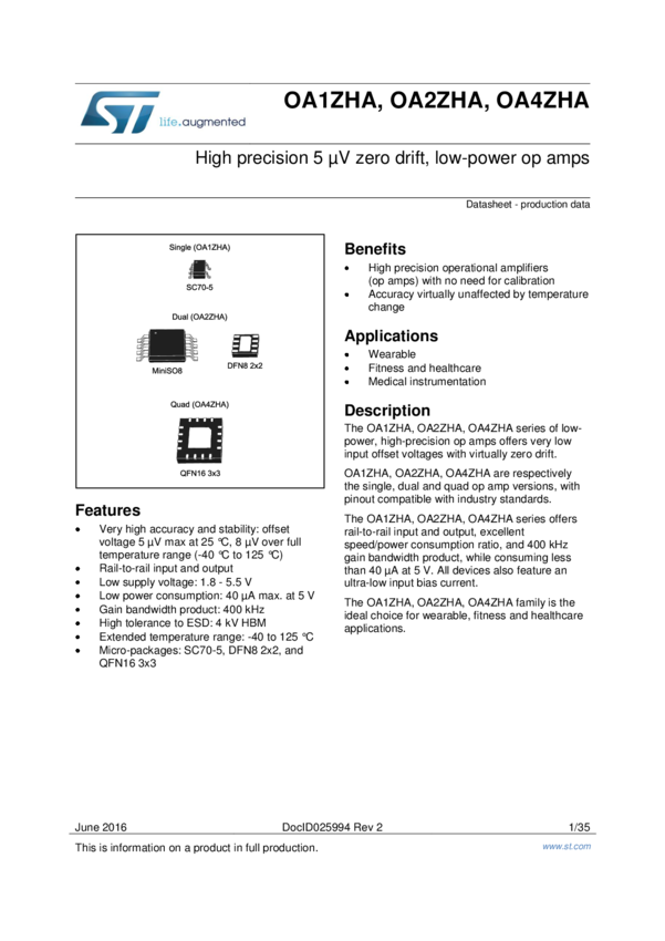 OA1ZHA High precision 5 uV zero drift, low-power single op amp