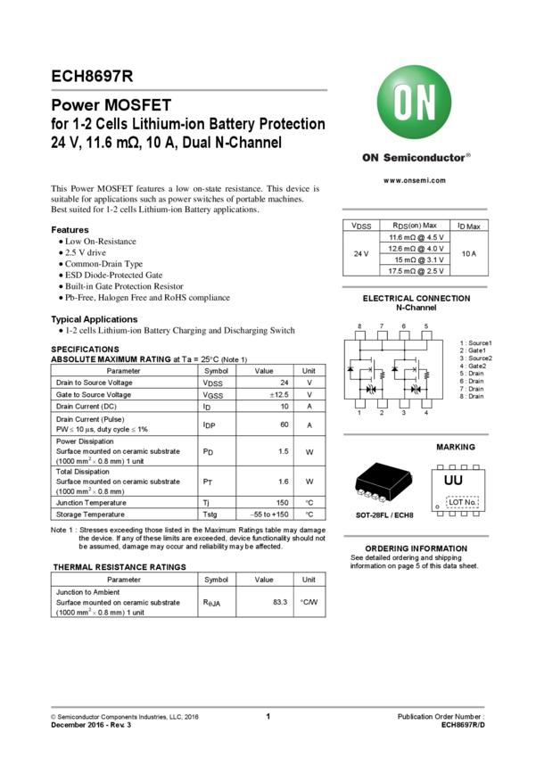 ECH8697R Power MOSFET for 1-2 Cells Lithium-ion Battery Protection, 24 V, 11.6 mΩ, 1...