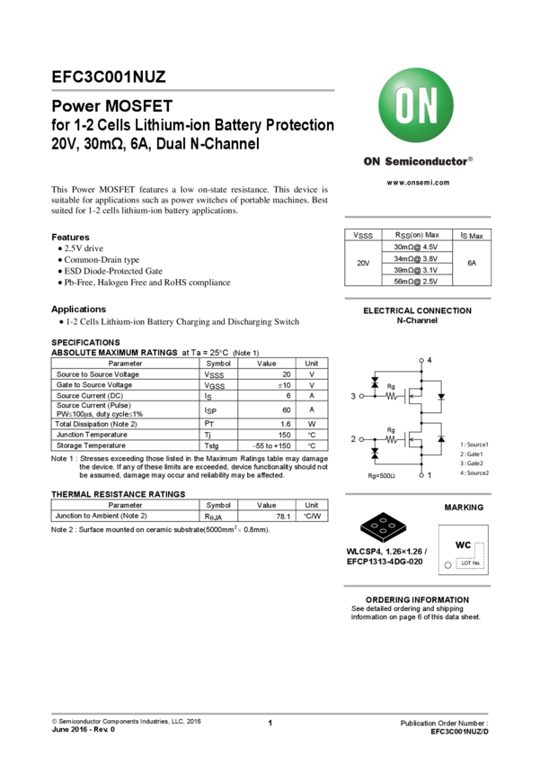 EFC3C001NUZ Power MOSFET for 1-2 Cells Lithium-ion Battery Protection, 20 V, 30 mΩ, 6 A...